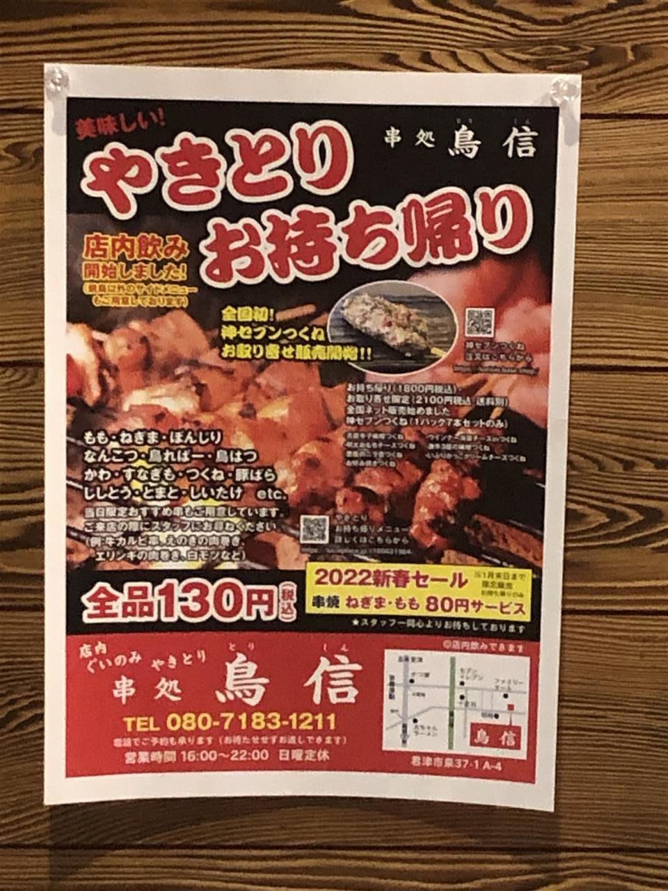 皆様、新年あけましておめでとうございます🎍昨年に引き続きよろしくおねがいいたします。焼鳥鳥信では、1月中にネットからのご予約でお持ち帰りで(もも、ねぎま)を80円にて提供させて頂きます。下記のサイトからのご予約をお待ちしております。https://www.hotpepper.jp/strJ001276775/amp/君津市で美味しい焼き鳥の持ち帰りをお求めなら、“焼鳥串処鳥信”へお越しください!お取り寄せにもおすすめです。千葉の地鶏『美白鶏(こはくどり)』を使用しており、香り高くジューシーな味わいの普通とは違った焼き鳥をお楽しみいただけます!特につくねがおすすめです!!